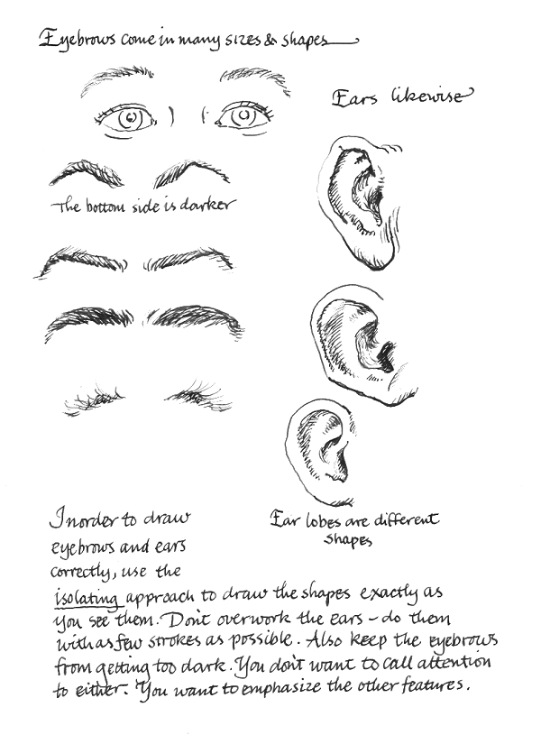 Practice: Draw several eyebrows and ears. Then add detail to the eyebrows and ears of the face you are drawing.