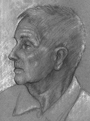 The distinctive thing about this sketch is the way that I have emphasized the 3-dimensional structure of the face - especially the brow, the eye, the cheek bone, and the ear. Notice how I have controlled the focus of attention by developing the detail in the areas that I want to emphasize and leaving other areas undeveloped (for example, the shirt collar). |